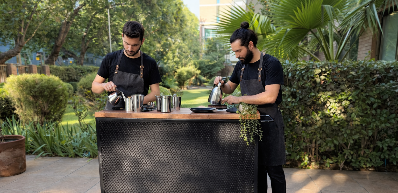 Un formato más ágil y funcional, pensado para eventos de mayor flujo. Consiste en una mesa operada por dos baristas, enfocada en rapidez y eficiencia.
